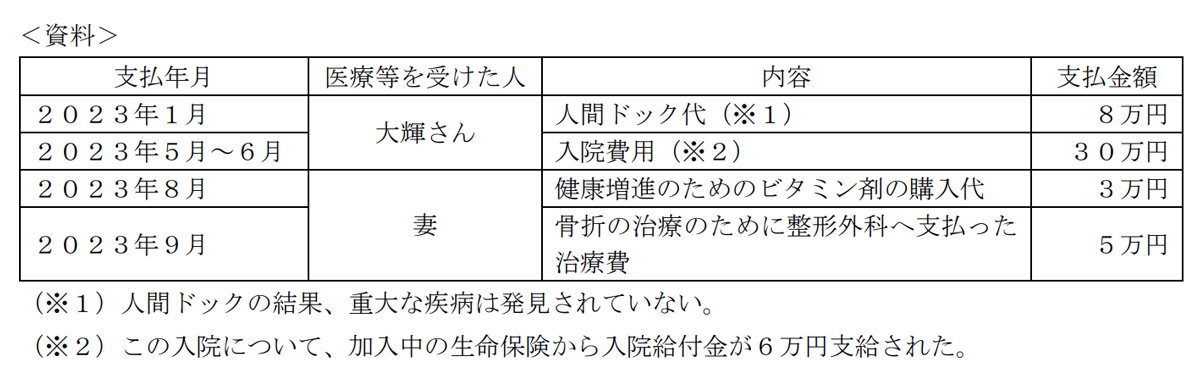 会社員の井上大輝さんが2023年中に支払った医療費等が下記<資料>のとおりである場合、大輝さんの2023年分の所得税の確定申告における医療費控除の金額として、正しいものはどれか。なお、大輝さんの2023年中の所得は、給与所得800万円のみであり、支払った医療費等はすべて大輝さんおよび生計を一にする妻のために支払ったものである。また、医療費控除の金額が最も大きくなるよう計算することとし、セルフメディケーション税制(特定一般用医薬品等購入費を支払った場合の医療費控除の特例)については、考慮しないものとする。