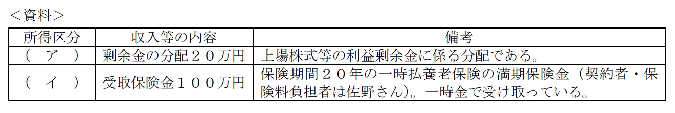 佐野さんの2022年分の収入は、下記<資料>のとおりである。<資料>の空欄( ア )と( イ )にあてはまる所得の種類の組み合わせとして最も適切なものはどれか。