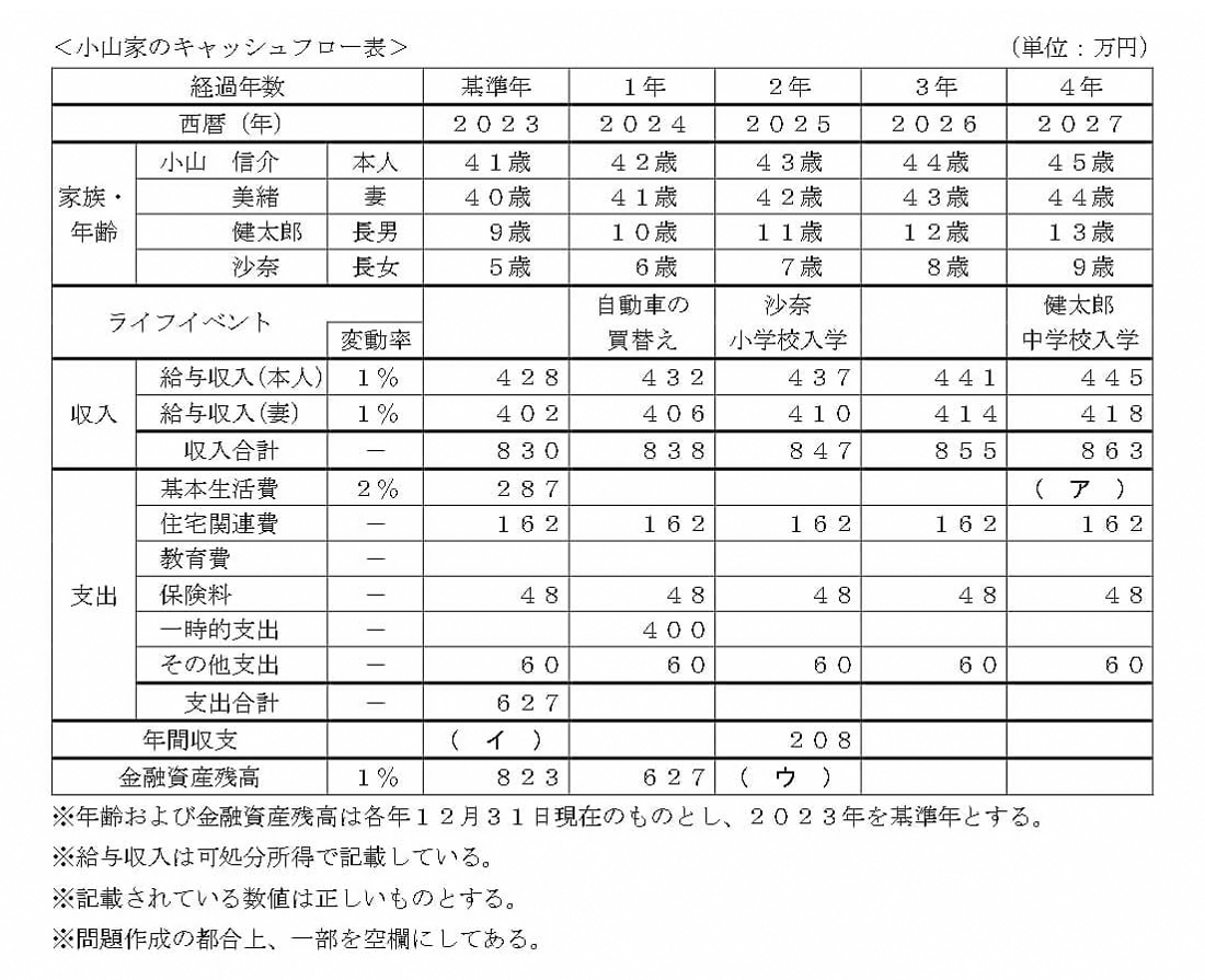 下記は、小山家のキャッシュフロー表(一部抜粋)である。このキャッシュフロー表の空欄( ア )~( ウ )にあてはまる数値として、誤っているものはどれか。なお、計算過程においては端数処理をせず計算し、計算結果については万円未満を四捨五入すること。
