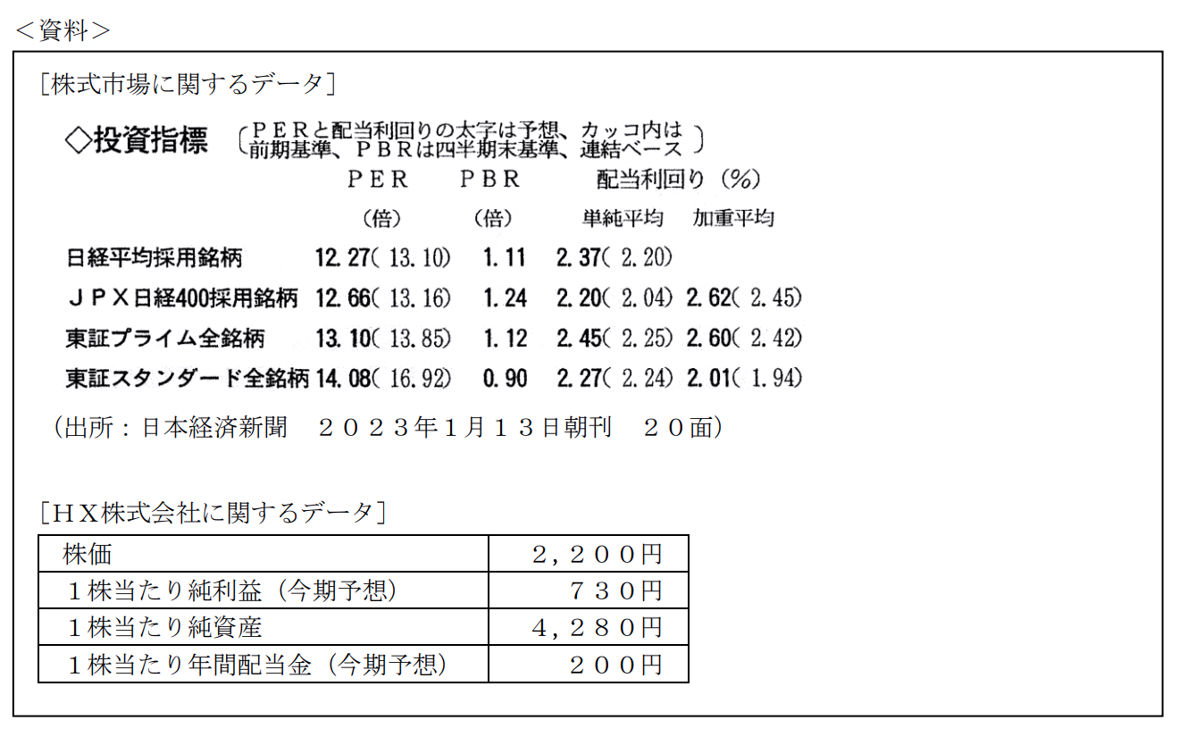 (1)HX社のPER=株価÷1株当たり当期純利益=2,200円÷730円=3.013倍