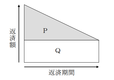 下図は、住宅ローンの( ① )返済方式をイメージ図で表したものであり、図中のPの部分は( ② )部分を、Qの部分は( ③ )部分を示している。