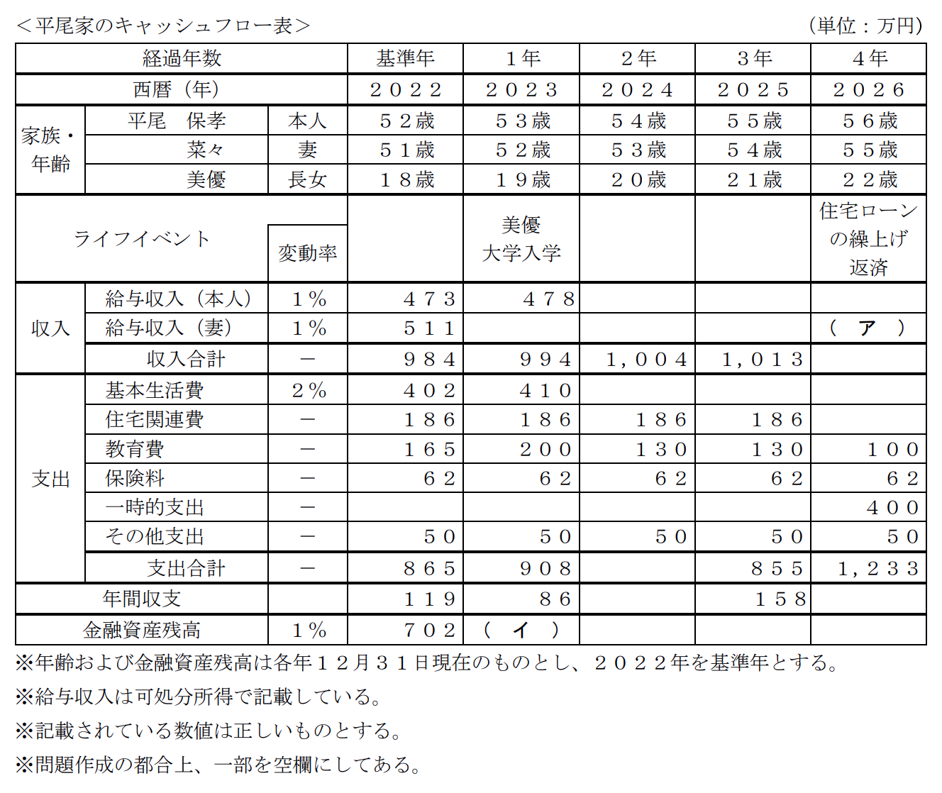 下記は、平尾家のキャッシュフロー表(一部抜粋)である。このキャッシュフロー表の空欄( ア )、( イ )にあてはまる数値の組み合わせとして、正しいものはどれか。なお、計算過程においては端数処理をせず計算し、計算結果については万円未満を四捨五入すること。