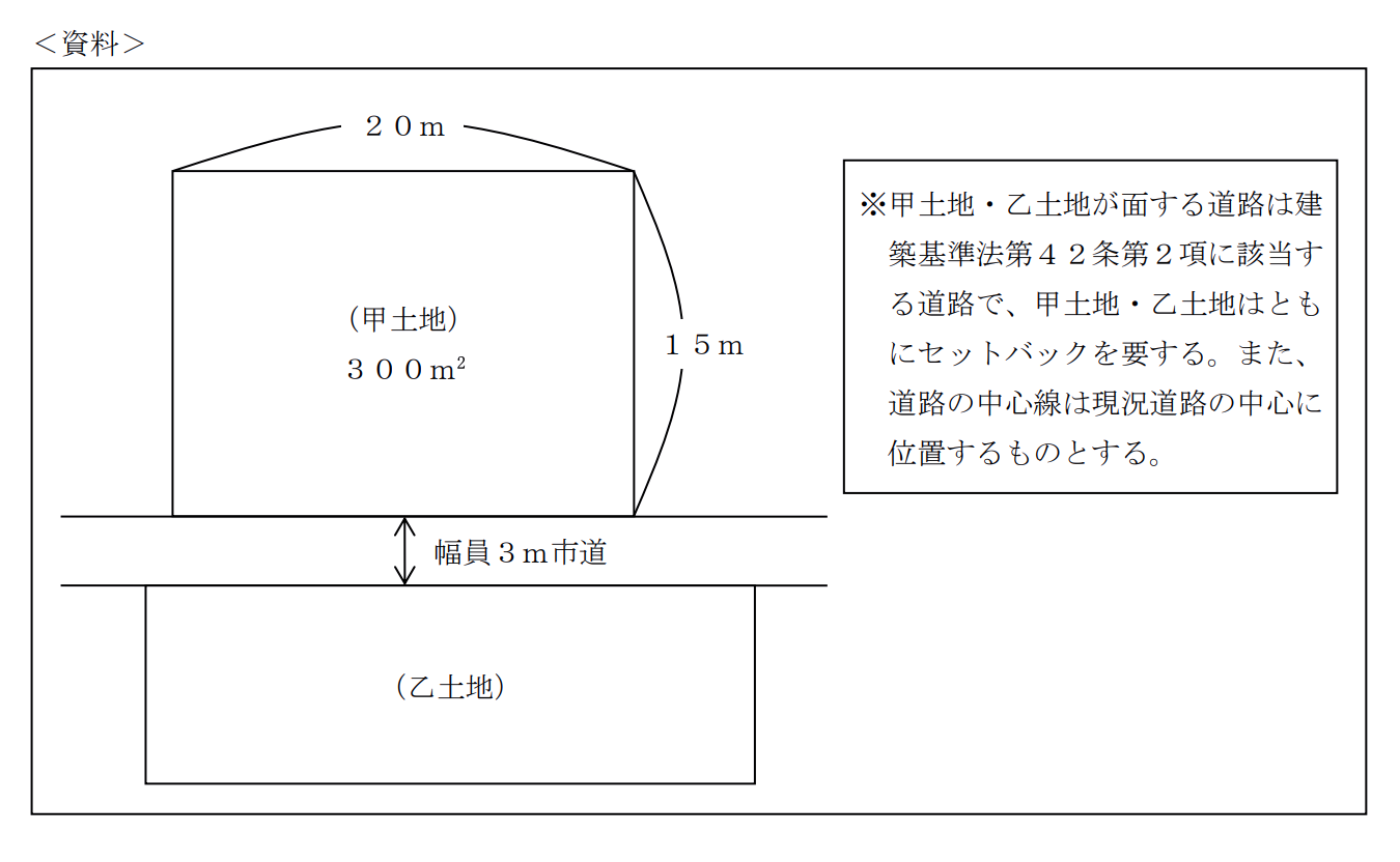 下記<資料>の甲土地の建築面積の最高限度を算出する基礎となる敷地面積として、正しいものはどれか。なお、この土地の存する区域は、特定行政庁が指定する区域に該当しないものとし、その他記載のない条件については一切考慮しないこととする。