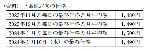 2024年1月10日(水)に死亡したAさんが所有していた上場株式Xを、相続人が相続により取得した場合の1株当たりの相続税評価額は、下記の〈資料〉によれば、( )である。