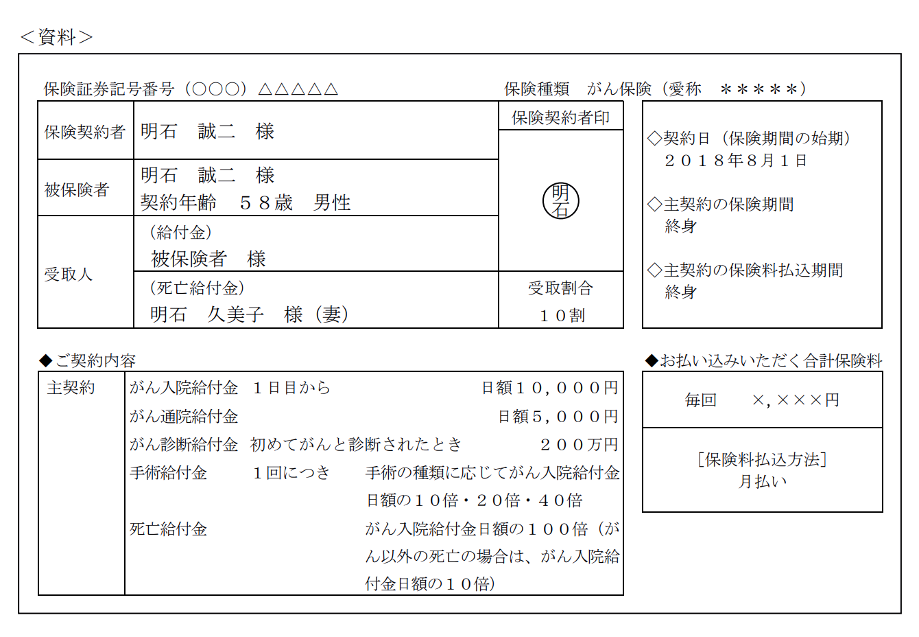 明石誠二さんが加入しているがん保険(下記<資料>参照)の保障内容に関する次の記述の空欄( ア ) にあてはまる金額として、正しいものはどれか。なお、保険契約は有効に継続しているものとし、誠二 さんはこれまでに<資料>の保険から保険金および給付金を一度も受け取っていないものとする。