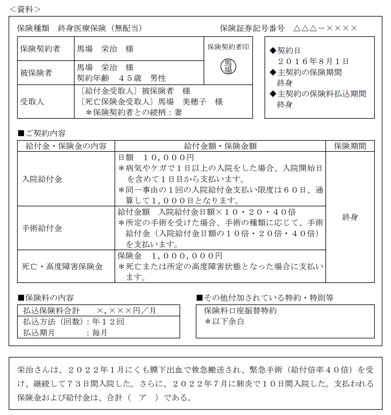 馬場栄治さんが加入している終身医療保険(下記<資料>参照)の保障内容に関する次の記述の空欄( ア )にあてはまる金額として、正しいものはどれか。なお、保険契約は有効に継続しているものとする。また、栄治さんはこれまでに<資料>の保険から保険金および給付金を一度も受け取っていないものとする。