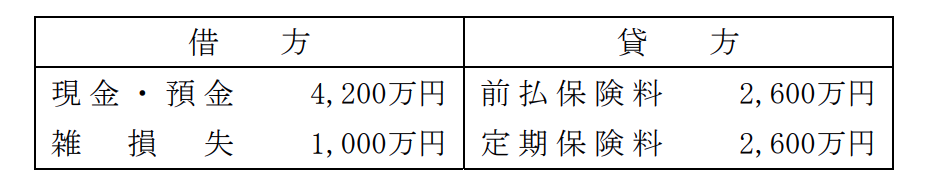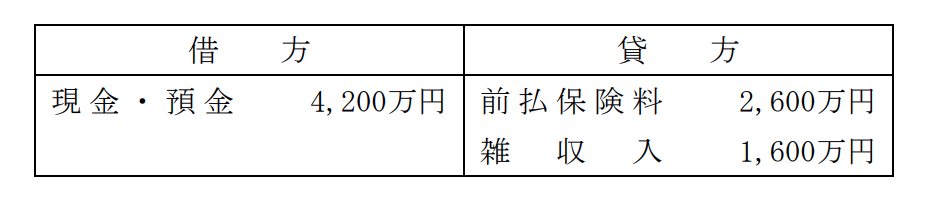 資産計上額2,600万円を取り崩し、現金(解約返戻金)4,200万円を資産計上し、差額の1,600万円を雑収入として処理します。