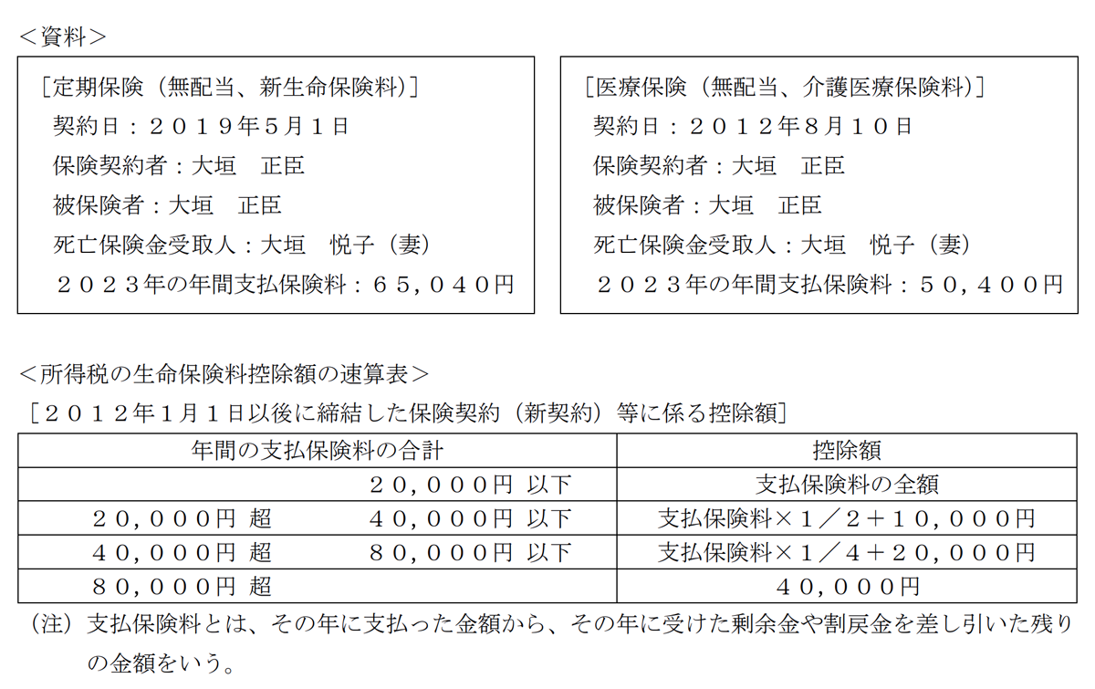 大垣正臣さんが2023年中に支払った生命保険の保険料は下記<資料>のとおりである。この場合の正臣さんの2023年分の所得税の計算における生命保険料控除の金額として、正しいものはどれか。なお、下記<資料>の保険について、これまでに契約内容の変更はないものとする。また、2023年分の生命保険料控除額が最も多くなるように計算すること。